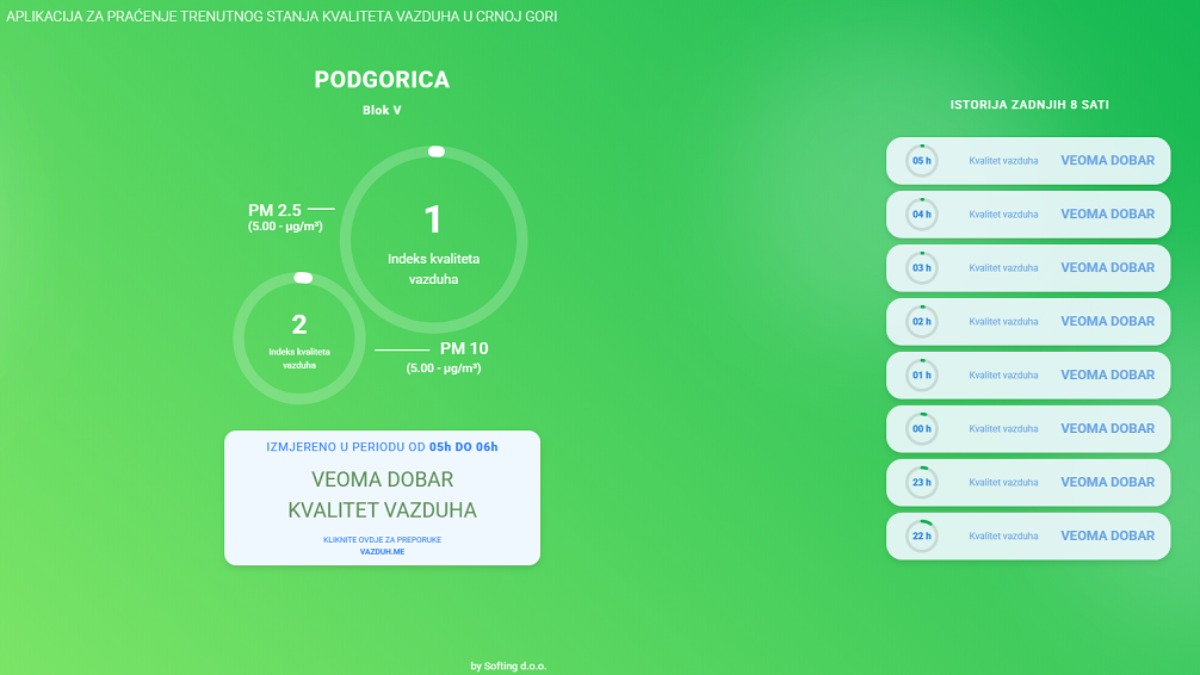 Na sajtu Vazduh.me možete vidjeti detaljan prikaz trenutnog stanja i pratiti eventualne promjene koje mogu uticati na vaše zdravlje.