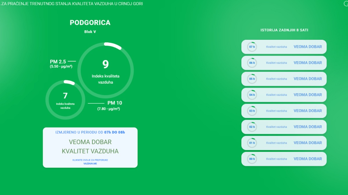 Na sajtu Vazduh.me možete vidjeti detaljan prikaz trenutnog stanja i pratiti eventualne promjene koje mogu uticati na vaše zdravlje.
