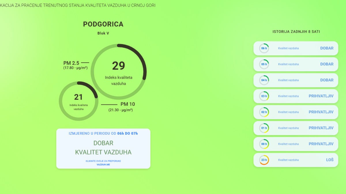 Na sajtu Vazduh.me možete vidjeti detaljan prikaz trenutnog stanja i pratiti eventualne promjene koje mogu uticati na vaše zdravlje.